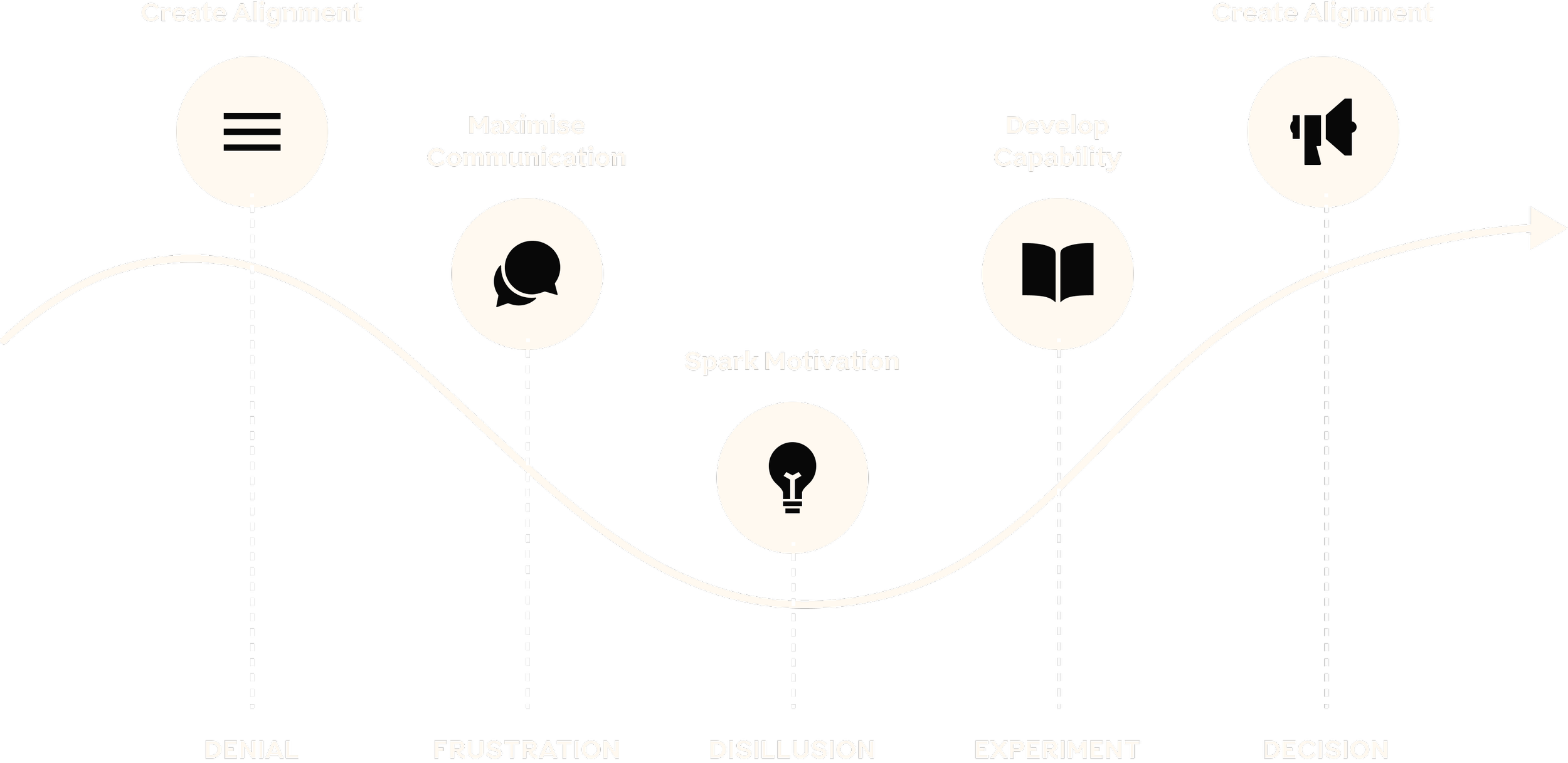 From denial to success. Transformation is more than a plan. It’s about people and progress moving forward together. Together with us, change feels human, achievable, and even inspiring. Our team guide you through complex transformation with pragmatic support, real partnership, and proven methods. Together, we make shifts that last and deliver true organisational impact.